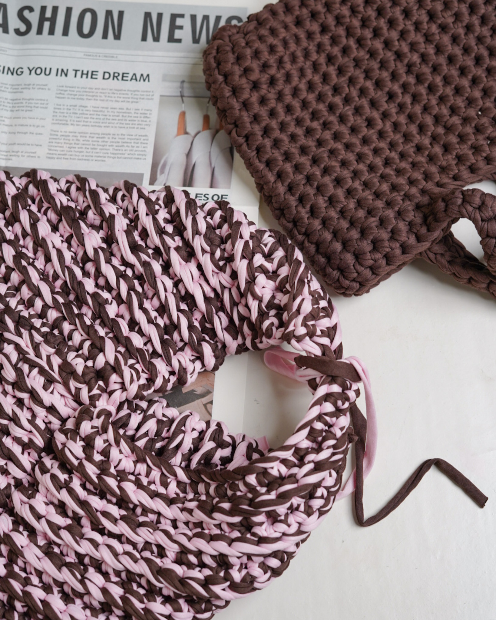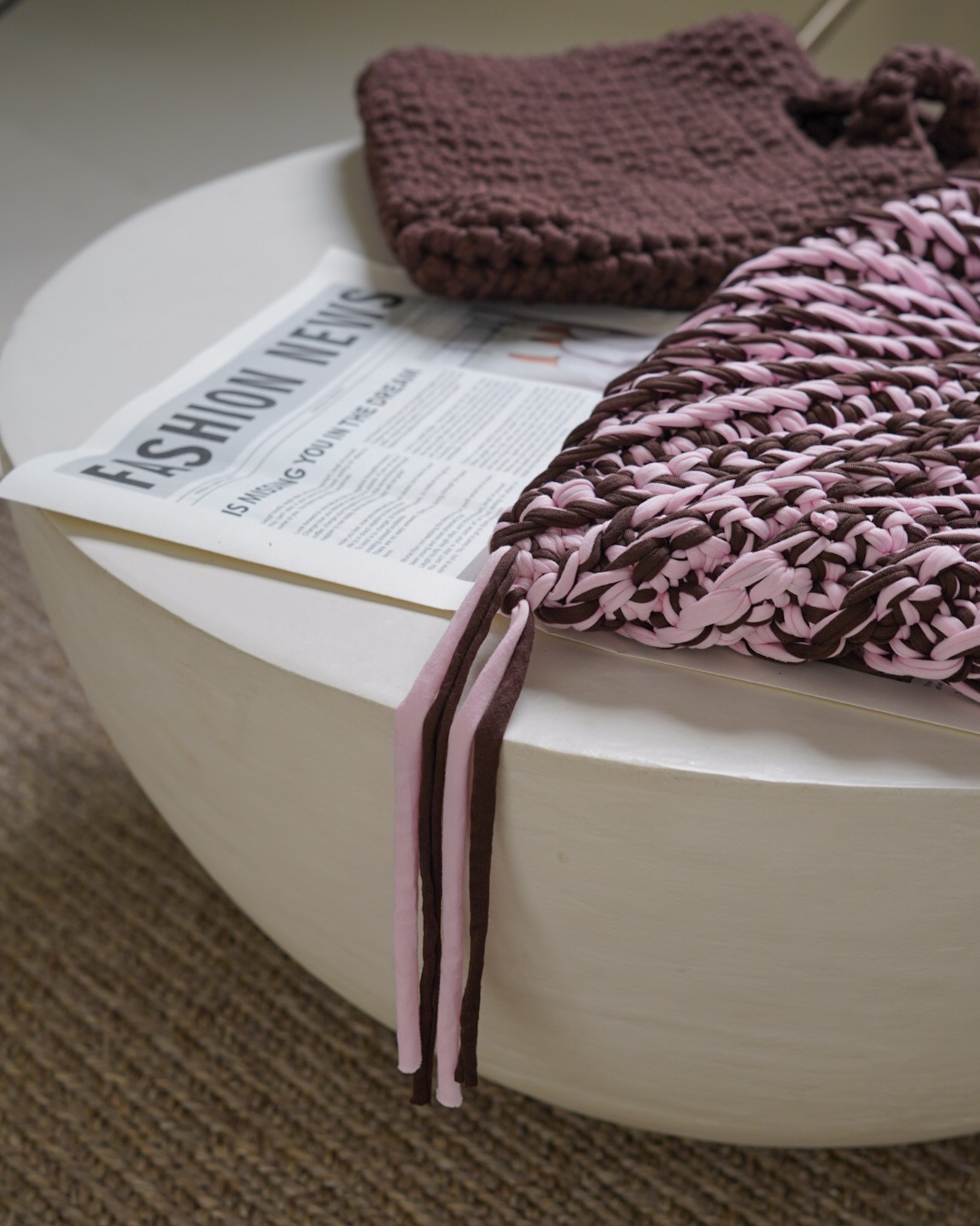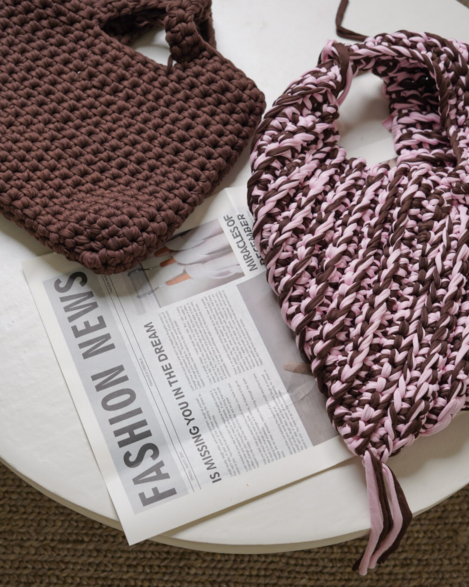 Lattice – a Warmstitch hand-crocheted tote in rich chocolate brown, featuring a tight woven lattice-inspired texture.