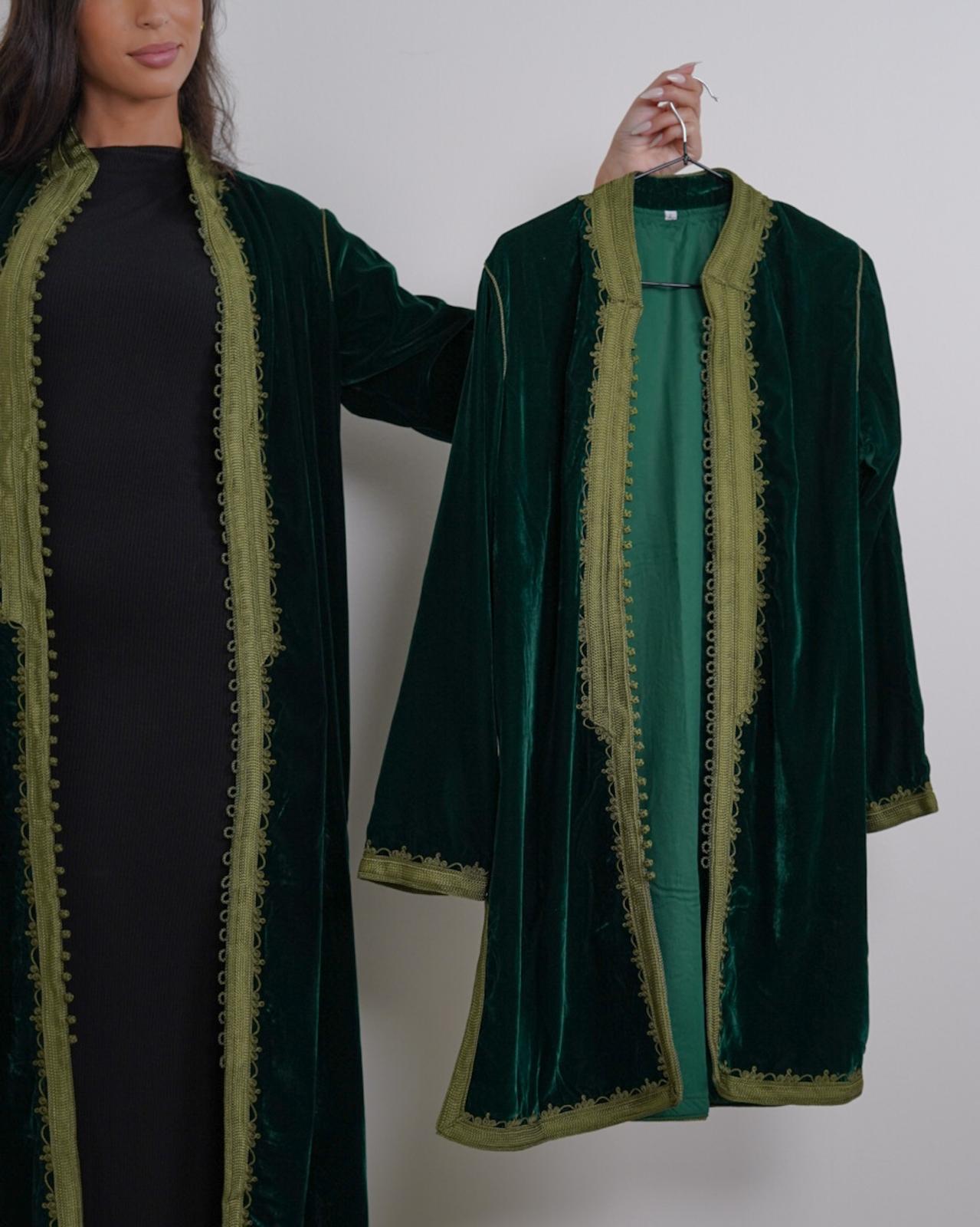 بشت زيتي بحواف زيتيه مخمل والحواف شغل يدوي قصير
